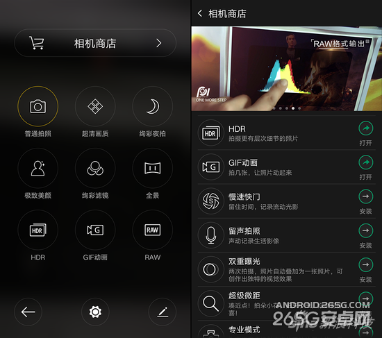 点击快门按钮上方的按键就能进入模式菜单,这里就能看到R7提供了非常多的拍摄功能,其中RAW格式是其它手机上极少见的。进入相机商店还可以下载安装更多的模式。