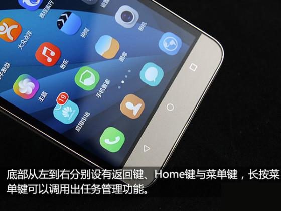 荣耀畅玩4X正面底部从左到右分别设有返回键、Home键与菜单键,长按菜单键可以调用出任务管理功能,不过其反馈力度略显不够扎实。