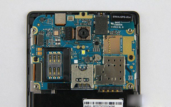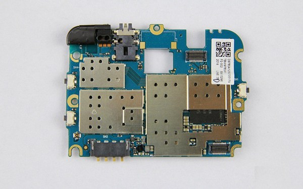 图为nibiru H1主板正面特写,正面上主要集成了该机的所有核心芯片,包括八核CPU、内存以及电源管理和基带芯片等等。这些所有芯片都被屏蔽罩罩着,并且采用不可拆卸设计,由于需要暴力破坏拆解,因此我们就不继续了。