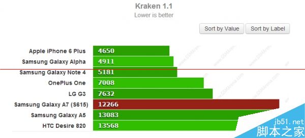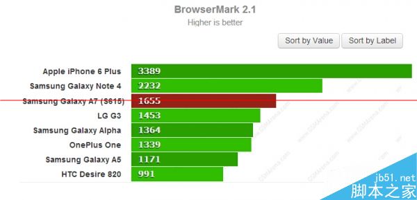 在网页测试中,A7的JavaScript性能让人大跌眼镜,即使三星的原生浏览器有开挂的JS引擎,但分数还是不太理想。