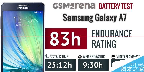 Galaxy A7的2600mAh电池和Galaxy S4接近,但骁龙615的功耗较大,而且5.5寸屏幕也对续航造成了一定的压力。不过让人惊喜的是,机器可以保持超过24小时的通话,以及接近10小时的网页浏览和视频回放,综合评定有83小时,已经和三星S5、索尼Z3相近,但低于Galaxy S4的90小时。