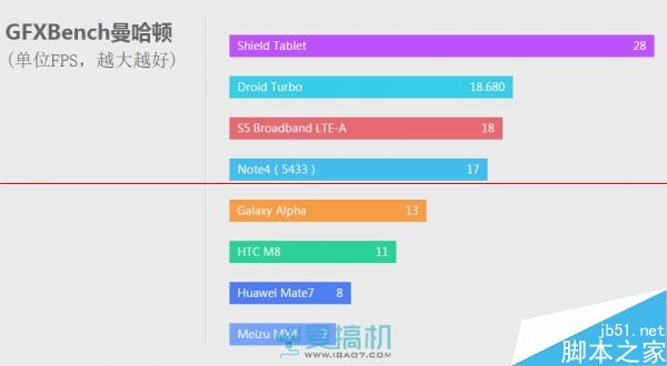 我们和主流的手机对比一下这项测试的帧数,可以看出Droid Turbo的图形性能在手机里面还是名列前茅的,但是对于怪兽级的Tegra K1来说,还是有较大差距。