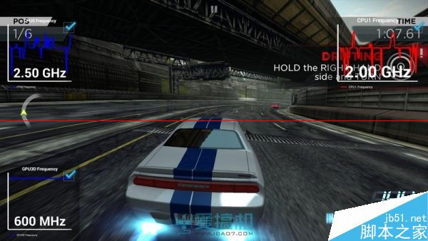 我们也进行了狂野飙车7的测试,在这个游戏中,刚进入游戏GPU频率就仅剩下300MHz…