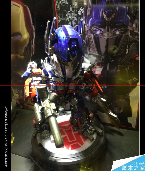 第三组样张,Droid Turbo的色彩表现依然给我们留下较好的印象,而且虚化效果也比iPhone 6 Plus更出色,不足的地方依然是解析力。而iPhone 6 Plus的色彩表现让我们大跌眼镜,留意钢铁侠的金色盔甲已经有明显发绿的倾向,缺少金色应有的光泽。