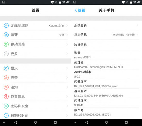 蓝魔MOS1搭载的MOUI1.0操作系统是基于目前最新的Android Lollipop 5.0.2操作系统。同时对于MOUI1.0来说,其最大的特点就在于纯净二字。有别于原生Android操作系统,MOUI1.0简化了系统逻辑,同时针对系统图标、交互界面等都进行了重新的梳理,同时不增加任何第三方应用,最大程度上将选择的权利交还到用户的手中。
