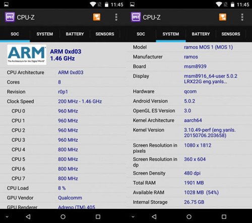 蓝魔MOS1采用了高通骁龙615八核64位处理芯片,同时辅以2GB LPDDR3 RAM以及32GB eMMC ROM,从硬件的配置上来说,这样的配置是能够进入到行业主流水平的。在智能手机行业全民进入64位时代之后,高通骁龙615已经证明它是一款非常不错的芯片产品了。