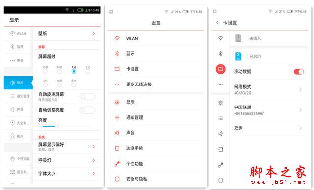 三, 设置界面新增一级菜单,设置路径更加清晰明了。2.0时期的设置界面有点类似魅族的设计,采用左右两栏并列菜单模式。这样的好处是一目了然。但是功能项的显示不够完整,同时不太符合用户的使用习惯。3.0改进了这一体验。保留二级菜单并列显示的模式,同时新增一级菜单,功能设置路径更加清晰明了。