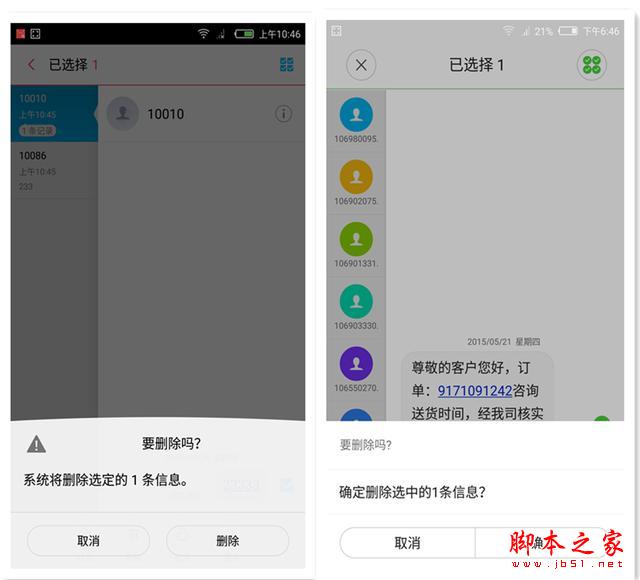 七, 短信界面与设置一样,新增一级菜单,信息分类更加清晰。同时联系人头像进行专门的色彩重绘,更加绚丽。