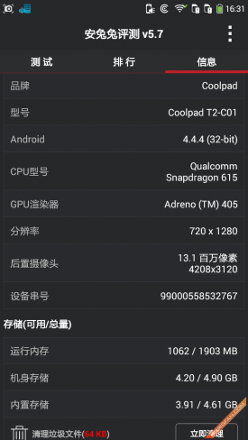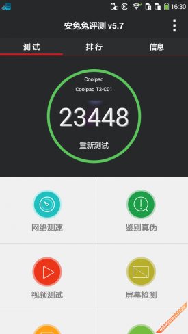 酷派锋尚Pro采用了一枚高通骁龙64位八核处理芯片,主频为1.7GHz,同时辅以2GB RAM以及8GB ROM,从实际的体验情况来看,整机的运行还是非常流畅的,在这里我们为大家奉上这部手机的跑分成绩,以方便大家能够更加直观的了解酷派锋尚Pro的性能情况。