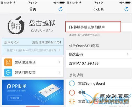 打开盘古程序,依次点击【小工具】-【日/韩版手机去除拍照声】就是这么简单,当然,前提是你需要越狱。点击【这里】查看。