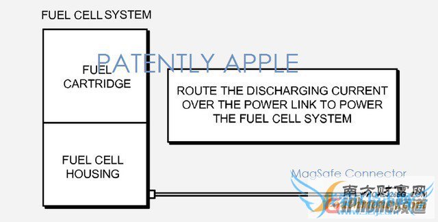 在这种专利一种可能的实施方案中,苹果的燃料电池,可以作为一个独立的供电模块,通过MagSafe连接线缆和苹果笔记本电脑连接。不过苹果也表示,这种供电设备可以采用市面上的其他线缆,除了供电之外,线缆还可以作为电子设备和燃料电池之间的通信管道。
