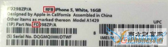 标签特征,iPhone 5 标签与 iPhone 5s 不一样,是纯黑的。iPhone 5 前面的“RFB”是 refurbished 的缩写,意为翻新。官翻机序列号开头为 DQG、DQH、C7G、C3M 等。