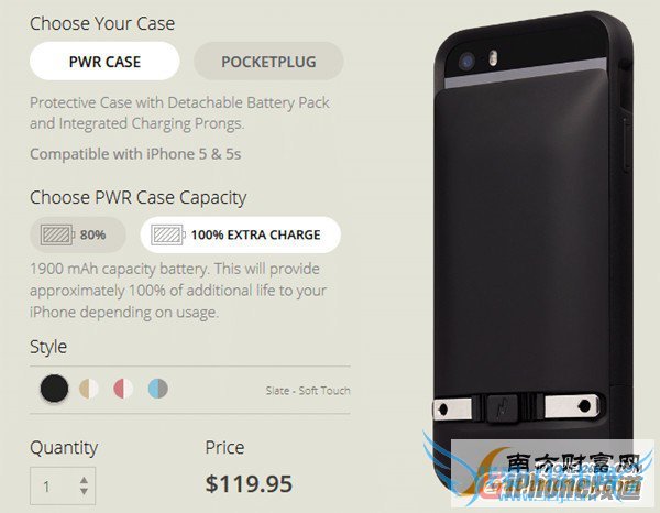 据报道,PWR Case 目前拥有两种款式,一种售价为99.95美元,附带 1500mAh 电池;另一种为 119.95 美元版本,电池容量为 1900mAh。此外,两种款式均有多种颜色可供选择。不过,PWR Case 目前只支持续航比较弱的 iPhone5/5S/4S/4 等旧版机型,而 iPhone 6/6 Plus 版本可能在未来才推出。