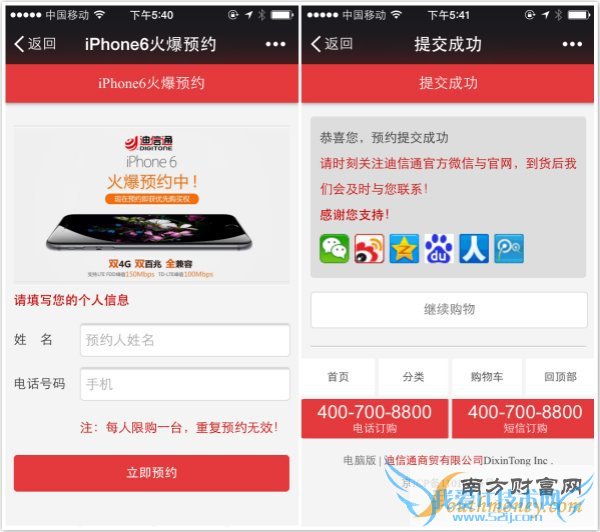 迪信通可以拥有两种方法进行iPhone的预定,第一种是通过微信通道进行预购,在官网iPhone6预约的页面,迪信通提供了微信二维码的扫码预约。