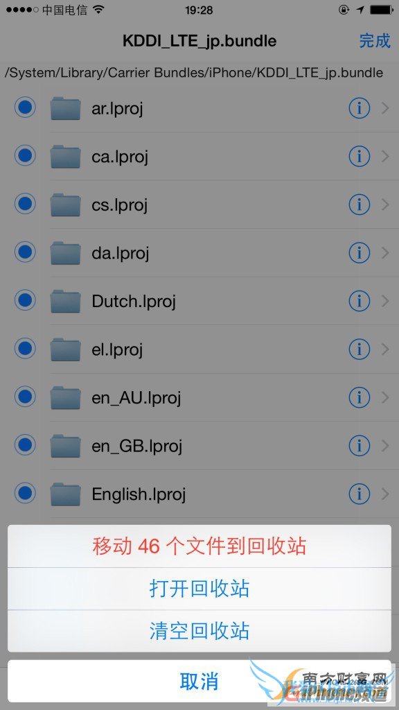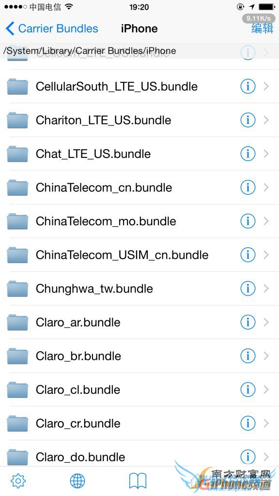 进入ChinaTelecom_USIM_cn..bundle文件夹,然后点右上角编辑,然后 长按屏幕空白区域,出现全选,