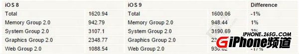 不过,就下图中的跑分数据来看,运行iOS9的iPhone6跑分成绩,反而比运行iOS8时降低了1%。考虑到现在距离WWDC2015还有一段时间,出现这样的跑分结果其实也不足为奇,毕竟每个iOS版本推出之后,还需要后续多个版本的磨合优化。等到WWDC2015时,苹果将正式向开发者们提供iOS9测试版,届时我们也将看到更加完善的iOS9。