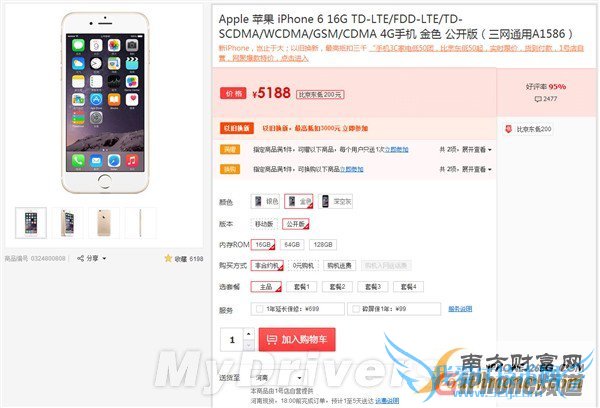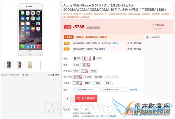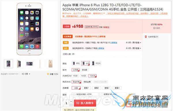 除了iPhone 6以外,iPhone 6 Plus也存在不同程度的优惠,金色128GB版的售价仅为6988元,比官网便宜800元。