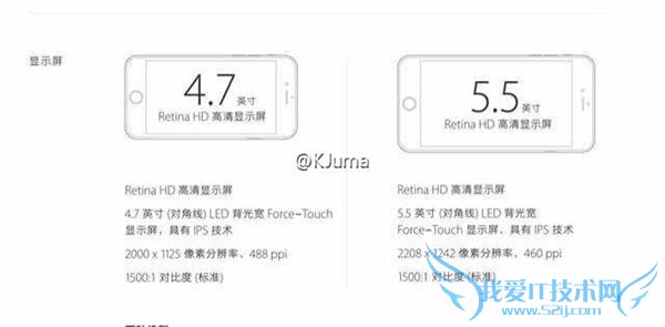 一张疑似苹果官方规格表的图片显示,iPhone 6S、iPhone 6S Plus继续维持4.7寸、5.5寸的屏幕大小,但是均支持Force Touch触摸技术,分辨率也分别提升至2000×1125、2208×1242,像素密度分别为488PPI、460PPI。