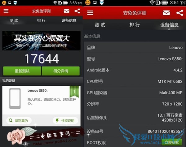 从安兔兔测试得知:联想S850安兔兔得分17644分,我们知道联想S850是针对女性的手机,但是这样的跑分丝毫不逊于其它同样配置的手机,跑分结果还是不错的。