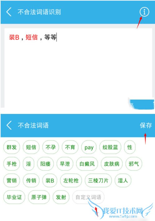 4、点击右上角的图标可以进入违规词语列表界面,您还可以自定义自己发现的违规词语,输入违规词语,点击“保存”按钮即可保存。