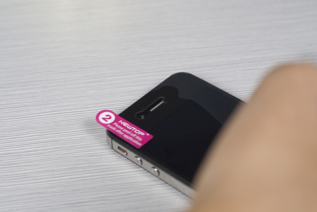 粘走屏幕的灰尘后就把膜上标有“1”的蓝色那一面揭下,仔细对齐手机屏幕位置轻轻把膜放上去,不要完全压紧。小编在这里推荐最好找准两个定位点,一个是横向的右下角和纵向的右上角来定位,确定好贴膜的位置后就从一边的角压紧后用卡片从该侧推向另一侧侧。