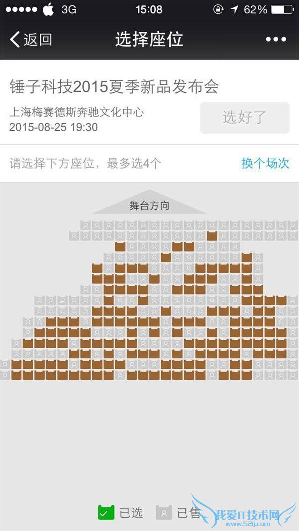 52ij手机之家科技快讯,锤子科技昨天宣布将在 8 月 25 召开 2015 新品发布会,今天下午发布会的门票通过腾信微票儿平台开卖,三面看台,七千五百人的场,可在线选座,发布会时长 120 分钟,分六个档位,售价为 120 元、160 元、240 元、320 元和 400 元,发布会将同时通过优酷、爱奇艺、腾讯视频、搜狐视频、凤凰网、芒果 TV、PPTV、bilibili 八家网站进行现场直播,在线直播免费,发布会所有收入将用于公益。