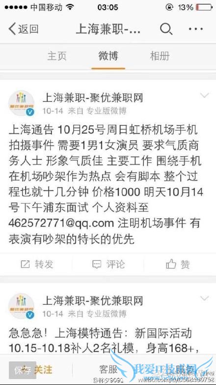 在“国产机不能上飞机”视频引发热议之后,有网友质疑为金立手机炒作,实际上金立在此前已经发布预告,表示将召开云端发布会,在炒作的质疑之后,微博为“上海兼职-聚优兼职网”中招聘在 10 月 25 日虹桥机场手机拍摄事件模特的微博被网友扒出,炒作之事几乎可以确定。