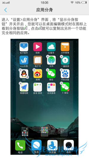 应用分身是个比较实用的功能,适合拥有多个社交账号的用户(目前仅支持QQ、微信和淘宝)。在桌面编辑模式下,单击有“ + ”标志的图标就能生成一个应用分身,该分身与主应用相互独立,数据不互通,相当于在另一台手机上使用相同的应用。需要注意的是,删除主应用的同时会删除复制出来的应用分身,而且会增加本地的数据和流量使用。