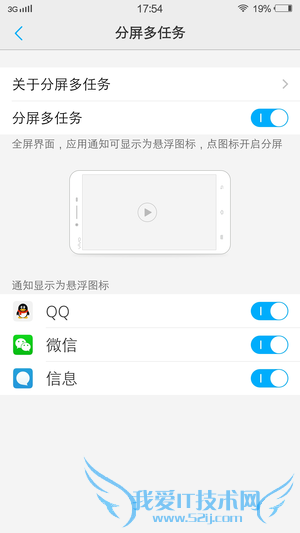 分屏多任务是Funtouch OS 的亮点,这个功能允许用户在全屏界面的情况下,对另一个应用进行操作。具体而言,当用户使用优酷视频等应用进行全屏界面使用时,如果有QQ 消息、信息或微信消息,便会弹出相应的悬浮图标,用户点击图标便可开启分屏,从而进行多任务操作。总体而言,这种属于“被动式”分屏,用户无法主动开启,只有在需要时才可选择开启。