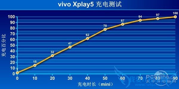 充电测试显示Xplay5在10min之内能充进540mAh的电量,而充满电的时间大概在90min左右,速度比不支持快充的手机快不少。