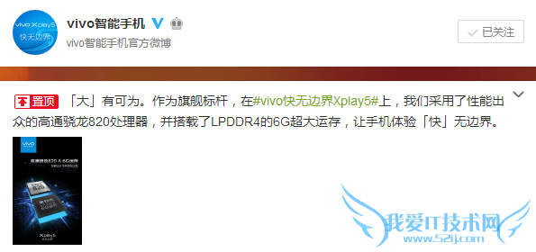 科技讯 2月22日消息,上周vivo公布了即将发布全新一代的旗舰Xplay系列新品Xplay5,而今早,vivo官方首次对外公布了部分Xplay5的硬件配置:高通骁龙820处理器+LPDDR4的6GB超大运存。