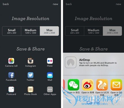 《AfterLight》点击屏幕可查看修图前效果,在每次操作之后,应用会在右下角自动记录,不过可惜的是,虽然会记录但却无法查看具体的步骤,仅能起到提醒的作用,没什么太大意义。制作完成的图片可保存成为不同的尺寸并分享至多个社交平台,当然其中最能展现文艺气质的还要算是Instagram了。除此之外,用户也可以选择其它平台或直接保存在相册中。