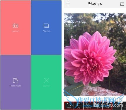 《B&W FX》是全英文版,不过使用起来非常简单,在用几次之后都能学会。应用共有5种可调节项,分别是:旋转、裁切、预调(滤镜)、调整、加文字,其中预调即为滤镜。不同于其它后期App,《B&W FX》仅提供单色滤镜,但这些滤镜却各有特点,用户可以根据拍摄题材选择不同的滤镜。当然用户也可以跳过这一步直接调整。