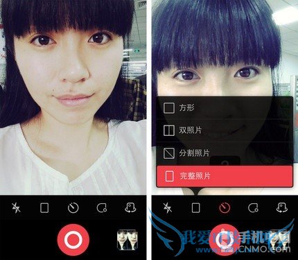《Camu》界面设计简单,几乎没有二级菜单,所有功能一次展现在屏幕下方,闪光灯、照片形状、自拍倒计时、调节景深范围、前后摄像头切换,虽然可设置项目不太多,不过越简单越能集中精力在自拍上。拍摄按键十分醒目,对于自拍来说更方便按下,它自带十种滤镜效果,不过这些并不需要在菜单中选择,只要轻轻滑动屏幕就能立即切换,对于那些有拍完之后马上分享习惯的用户来说,省去了大量的时间。