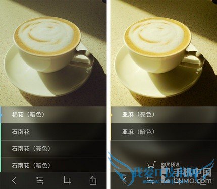 Litely为每个滤镜都起了非常好听的名字,不像其它应用使用难以理解的英文名称,棉花、石楠花、亚麻,文艺中还透着一丝温暖。在屏幕上左右滑动即可调节滤镜的力度,Litely给了用户更多自由发挥的空间。在调节的时候您会发现,点击屏幕时菜单会占去很多的空间,不过也不用担心,只要倾斜一下手机就能看到图片的全貌了。