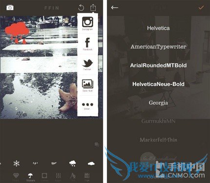 滤镜是《FFIN》的主打内容,讲究点的用户还可以利用它修改细节部分,比如暗角、噪点、亮度等等,还可添加边框及文字,合理搭配的话,一张文艺范儿十足的作品就出炉了。