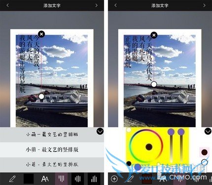 好了,接下来就是最重要的一步了:加文字。《小萌》特点在于,只能加竖版文字,唯美且文艺,另外最重要的是,《小萌》提供了多种中文字体,手写体、印刷体、娃娃体应有尽有保证你挑到眼花。竖版文字支持三种对齐格式,分别为上对齐、下对齐以及居中,用户可根据照片内容以及边框样式来选择。