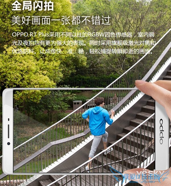 OPPO R7 Plus除了保留了OPPO自家独有PI原画引擎系统外,1300W像素主摄像头还配备了索尼最强悍的IMX278 RGBW四色传感器,具备最出色的夜拍效果。采用独家的全局闪拍系统,拥有全新的双驱混合对焦系统,它包含传统的反差式对焦和全新的PDAF相位对焦,结合优选防抖,做到启动快、对焦快、成像稳这“二快一稳”。此外,OPPO R7 Plus配备了800W像素黄金视角摄像头。