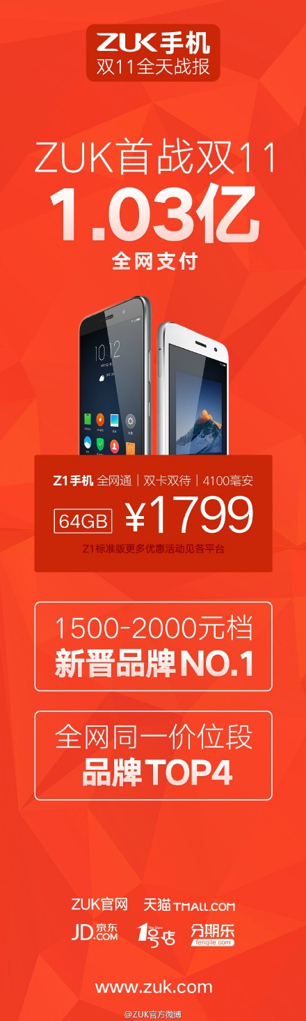 凤凰科技讯 11月12日消息,轰轰烈烈的双11已经结束,各品牌也都在今日发出了自家最终的战报。而根据ZUK发出的战报来看,截止至11日23时59分59秒,ZUK官网、天猫、京东、1号店、分期乐等全网支付额为1.03亿元。