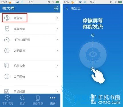 打开鲁大师点击屏幕最下方的“更多”即可找到暖宝宝功能,大家都明白摩擦生热的原理,鲁大师同样利用了这一点,用户需要用手指不断摩擦屏幕才能开始加热。