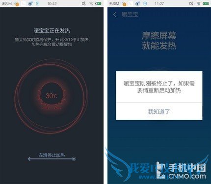 那么热到什么程度才会停止呢?如果手机的温度过高会对硬件造成损坏。其实这一点您大可不必担心,鲁大师提供了实时监测保护,当手机的温度升高至35度时会立即停止加热,并且还会用振动的方式提示用户加热已完成。
