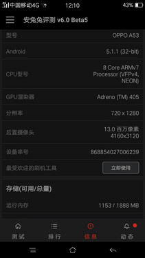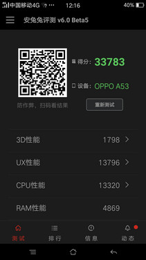 在硬件配置方面,OPPO A53采用64位高通616八核处理器,集成Adreno 405 GPU,内存配置为2GB RAM和16GB ROM,相比R7s来说,主要是RAM/ROM有缩水。安兔兔跑分成绩为33783,属于中端主流水准,看高清视频打游戏基本都可以胜任。