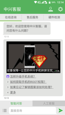 对新手来讲,当遇到一些问题又不好意思张口时,例如怎么样升级手机系统?如何获得ROOT权限?忘记解锁密码怎么办?……可通过中兴客服来找答案。如果遇到售后问题,还可在售后服务页面进行预约或亲自去服务网点维修。