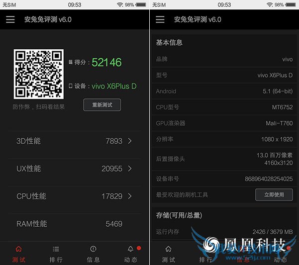 联发科MT6752是一款64位八核4G LTE平台芯片,基于ARM Cortex-A53架构打造,最高主频1.7GHz,图形芯片为MaLi-T760。MT6752具有高性能低功耗的特性,配合4GB的超大运行内存,其实vivo X6Plus的性能是不差的,尤其是多任务运行的时候。从安兔兔V6.0的跑分来看,该机也能轻松破万,虽然这个得分也顶级的旗舰有较大的差距,但是满足日常所需是毫无压力的。