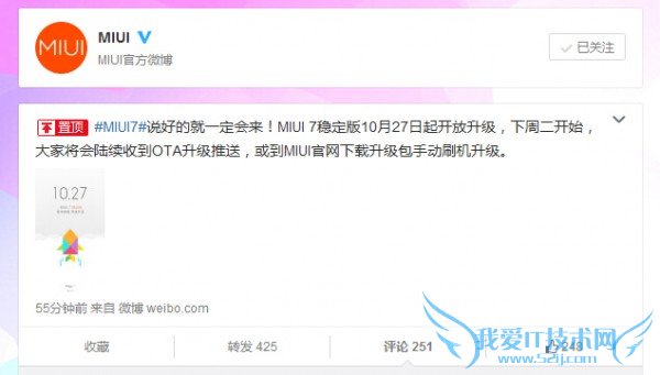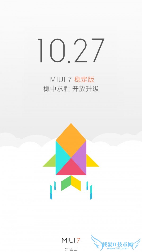 科技讯 10月21日消息,据科客网报道小米自8月份公布MIUI 7以来,一直受到不升级安卓系统版本”、“仅仅是换皮肤”的吐槽,不过目前来MIUI 7的测试版还是表现不错。而小米刚刚官微宣布,MIUI 7稳定版10月27日起开放升级,下周二开始,大家将会陆续收到OTA升级推送,或到MIUI官网下载升级包手动刷机升级。