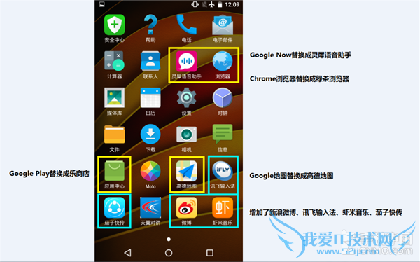 最后,当然就是替换了不少原生Google/Android应用,Google Play替换成乐商店,Google Now替换成灵犀语音助手,Chrome浏览器替换成绿茶浏览器,Google地图替换成高德地图,同时阉割了Google派系的一众内置应用,例如Google环聊。针对消费者反应在上几个版本系统中缺少必备应用,Moto X 极这次也增加了新浪微博、讯飞输入法、虾米音乐、茄子快传等应用。