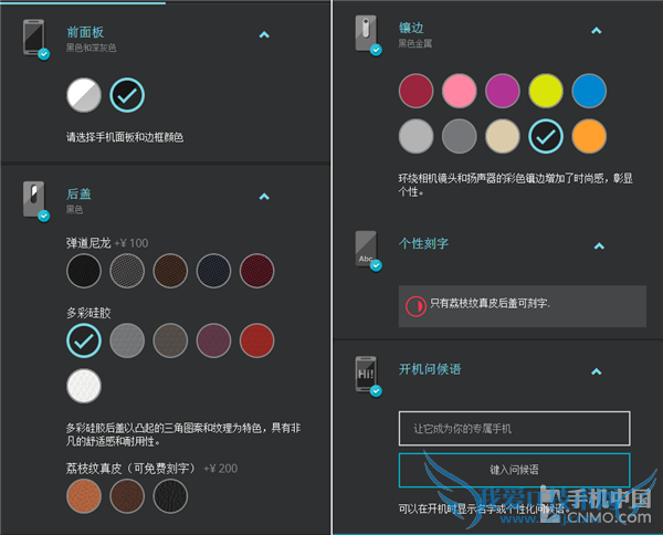Moto X 极和Moto X Style一样,支持Moto Maker个性定制服务,这项服务在今年5月底终于在国内上线。和Moto X Style相比,Moto X 极的定制化服务提供了弹道尼龙、多彩硅胶、荔枝纹真皮三种后盖,其中,荔枝纹真皮后盖支持免费刻字服务。整体上可定制的范围虽然不及Moto X Style丰富,但是尼龙、硅胶和真皮也是消费者最喜欢的三种后盖,已经无伤大雅了。小编手上这台Moto X 极属于多彩硅胶版本。