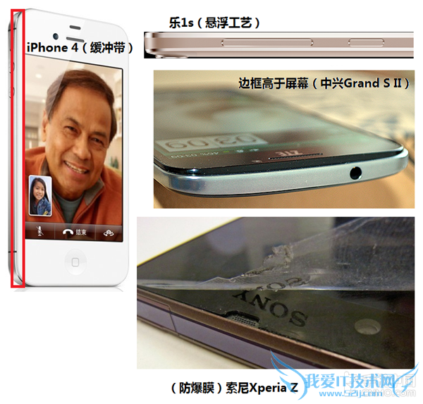 1、iPhone 4:在屏幕和金属边框之间加入塑料边框作为缓冲带