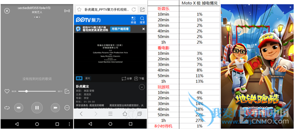 回到Moto X 极最终测试结果,在功耗相对更低的听音乐环节(用系统内置的虾米音乐播放器),Moto X 极很好地控制了功耗。而功耗相对更大的看视频和玩游戏环节,Moto X 极很好地控制了功耗的增幅,用系统内置的绿茶浏览器观看超清视频,玩地铁跑酷这种轻量级的游戏,最终耗电情况也在意料之中。8小时待机测试表现良好,一个晚上只掉1%电量。Moto X 极还有TurboPower这项快速充电技术加持,所以整体续航表现不用过于担心。
