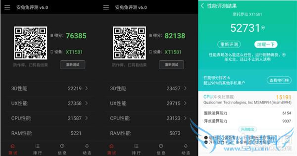 搭载了Qualcomm骁龙810的Moto X 极在安兔兔(跑了两次分)和鲁大师的得分如下图所示,相比Moto X Style有了一定的进步: